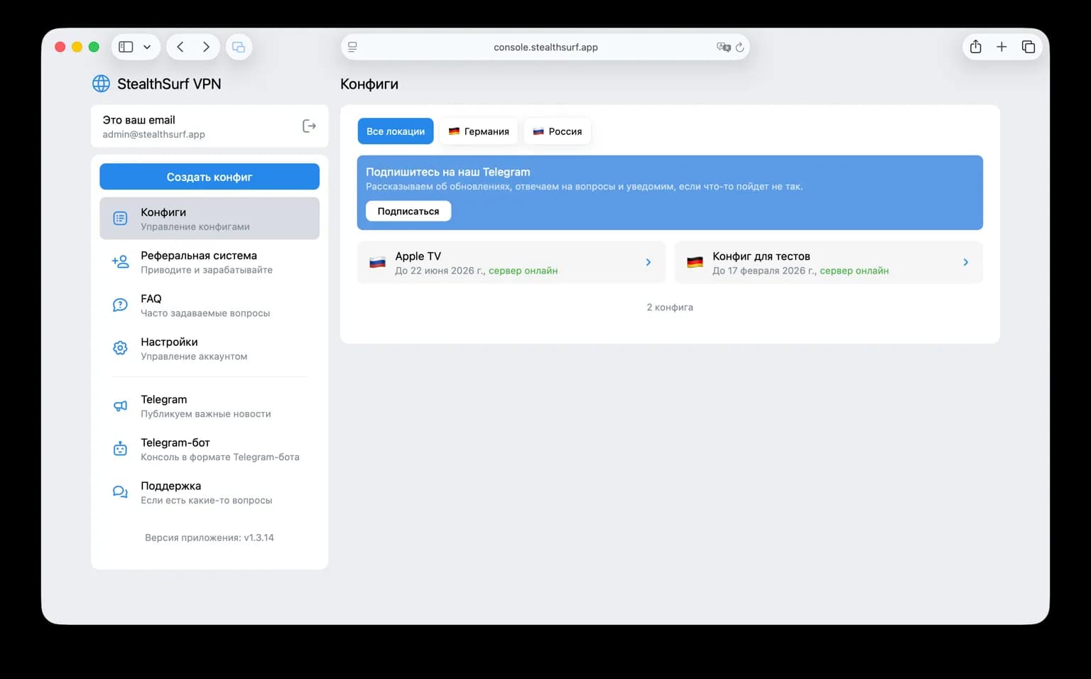 Здесь вы создаёте и настраиваете конфиги, продлеваете их срок действия и управляете реферальной системой. Все изменения выполняются именно на этом портале.