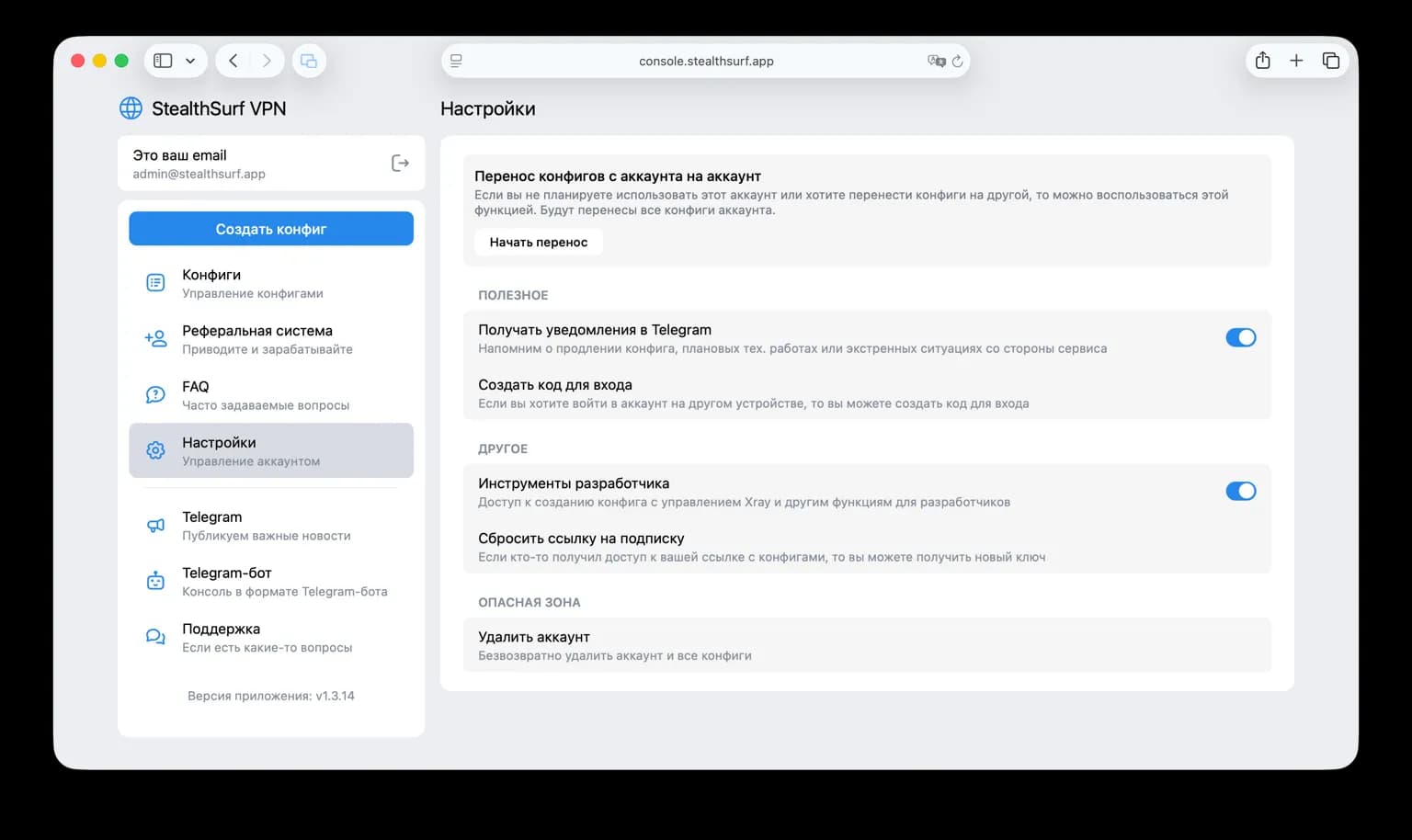 Чтобы получить возможность изменять настройки конфига, включите «Инструменты разработчика» на вкладке «Профиль».
