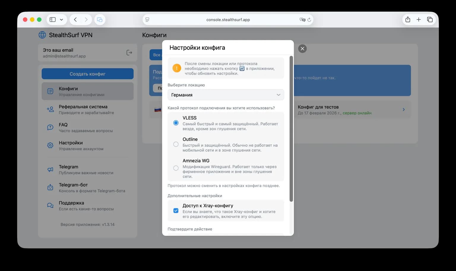 Когда доступ получен, откройте свой конфиг — теперь появится новый раздел «Xray-конфиг», перейдите в него.