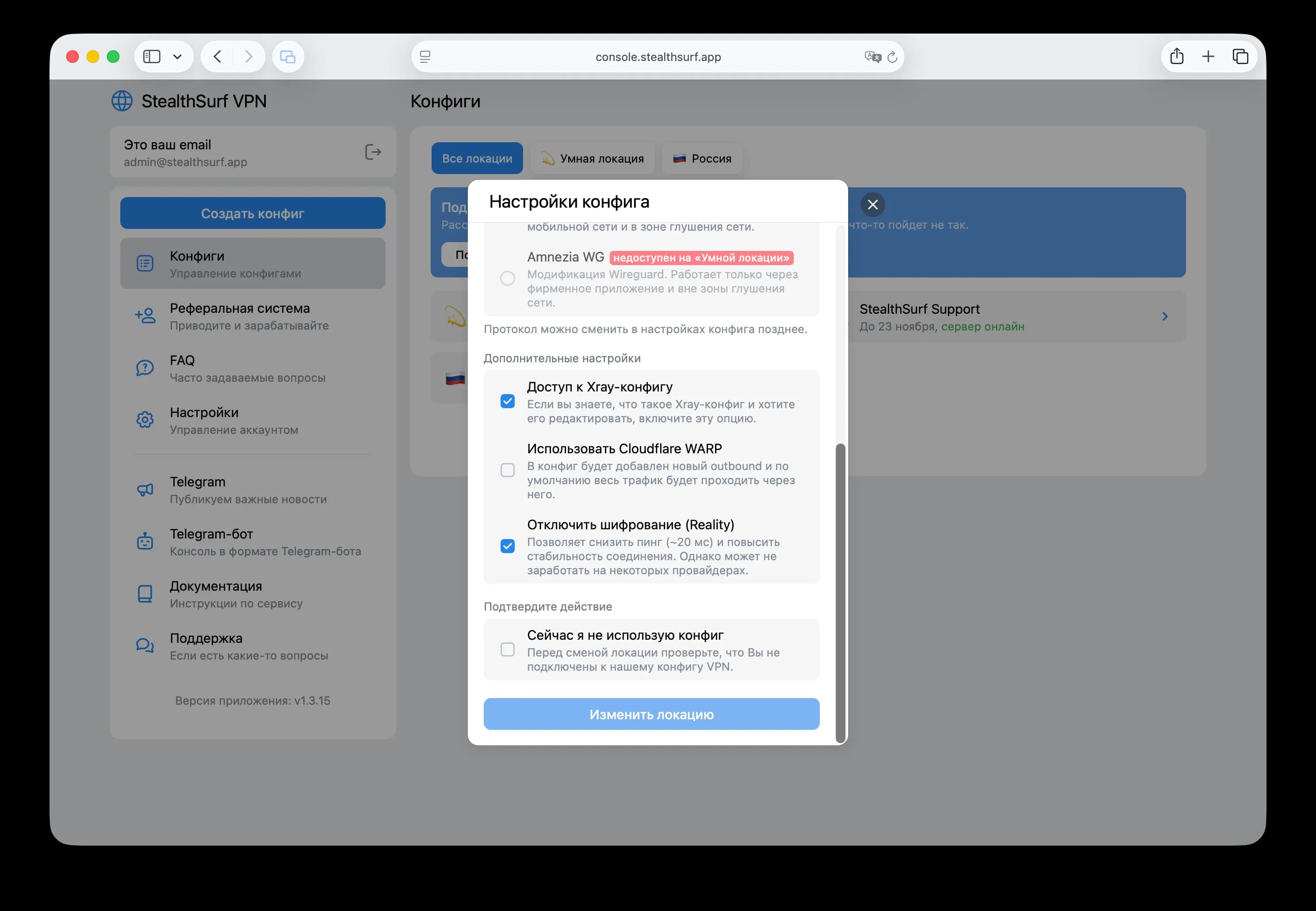 Установите галочки напротив пунктов «Доступ к Xray-конфигу» и «Отключить шифрование (Reality)».