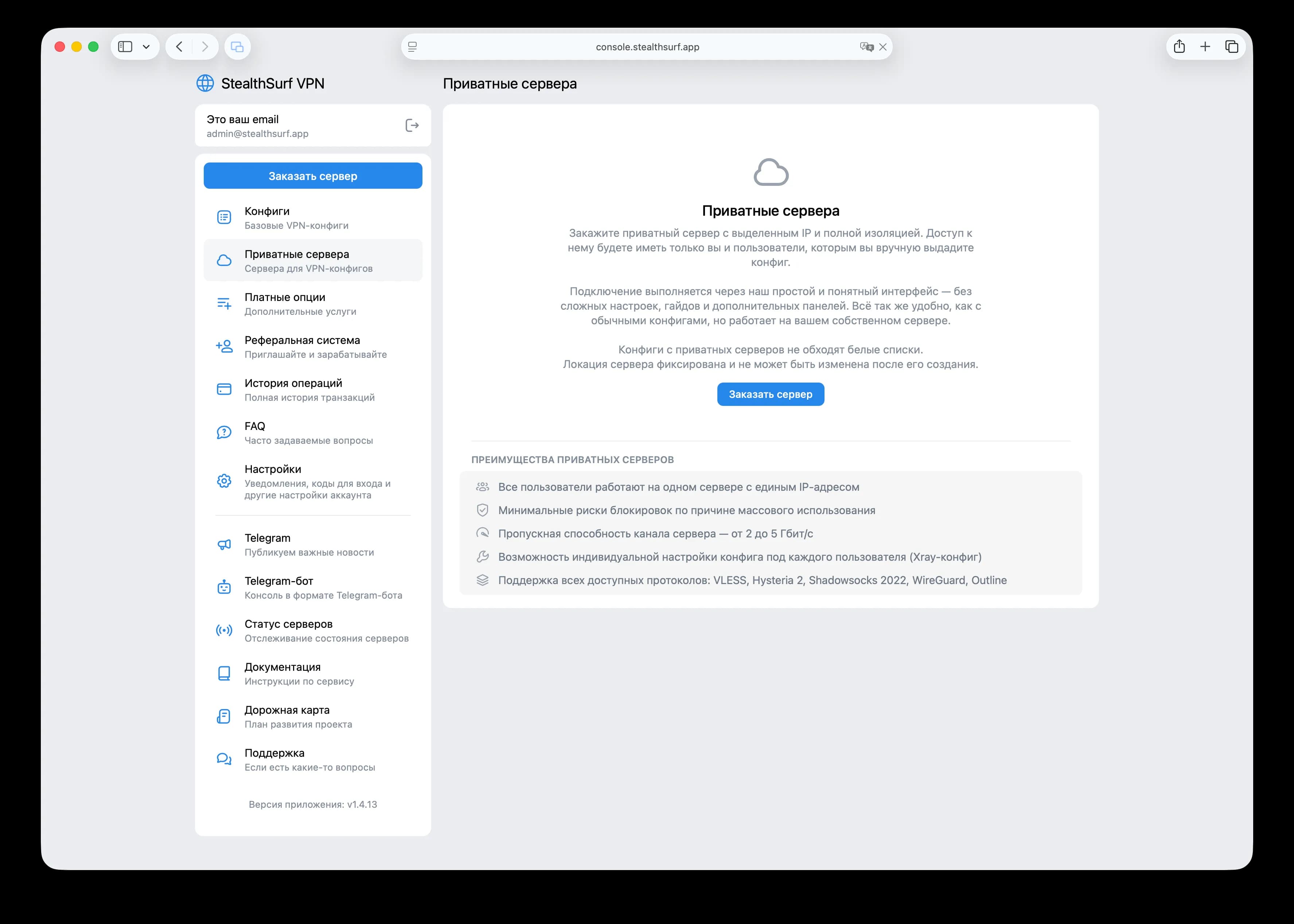 Приватный сервер — это выделенный VPN-сервер с собственным IP-адресом и полной изоляцией от других пользователей. Доступ к нему будете иметь только вы и те, кому вы вручную выдадите конфиг.