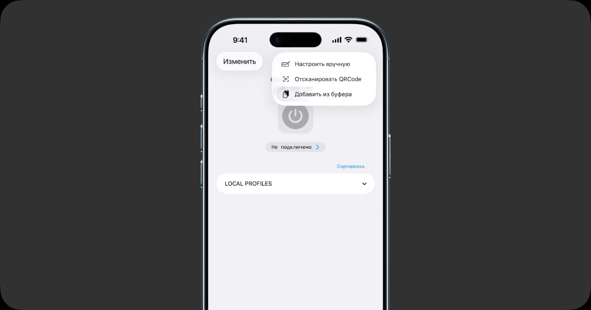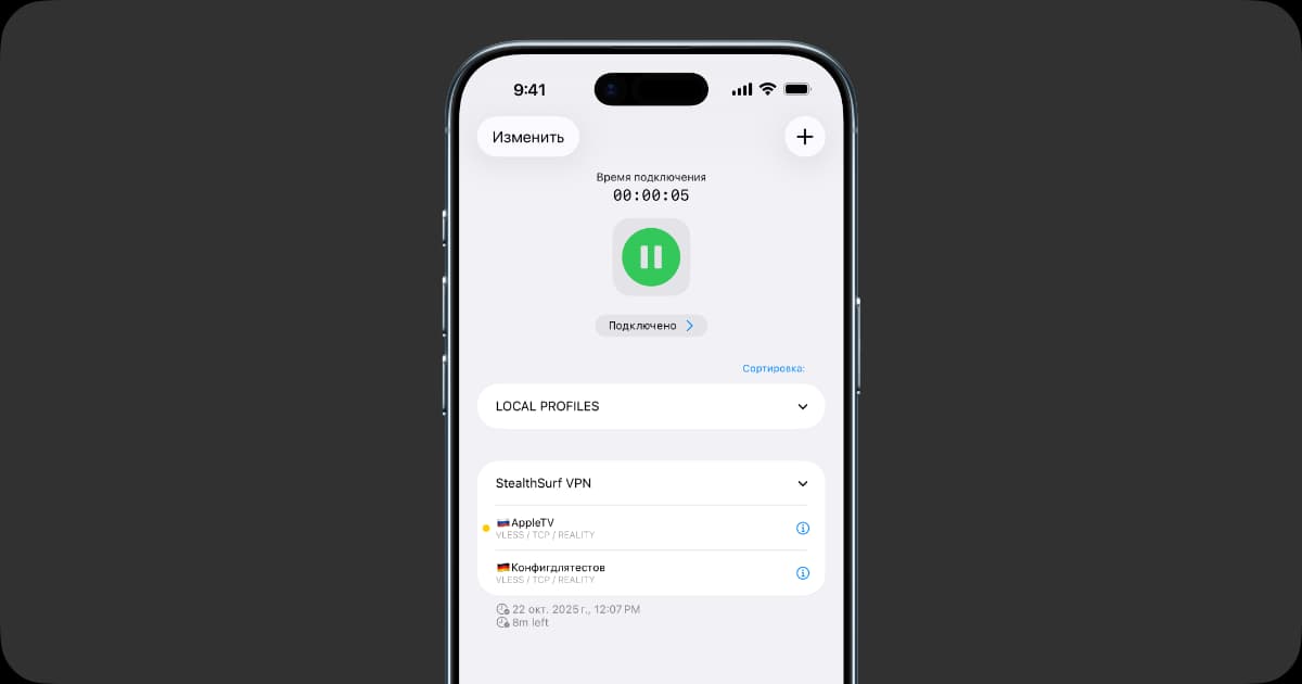 Приложение может запросить разрешение на добавление VPN-конфигурации в систему — подтвердите его.