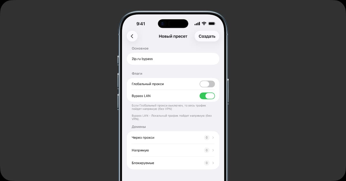 Укажите в списке domain:2ip.ru, затем вернитесь на предыдущую страницу и сохраните пресет.